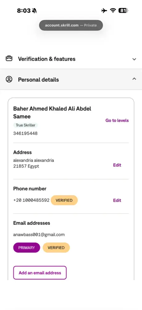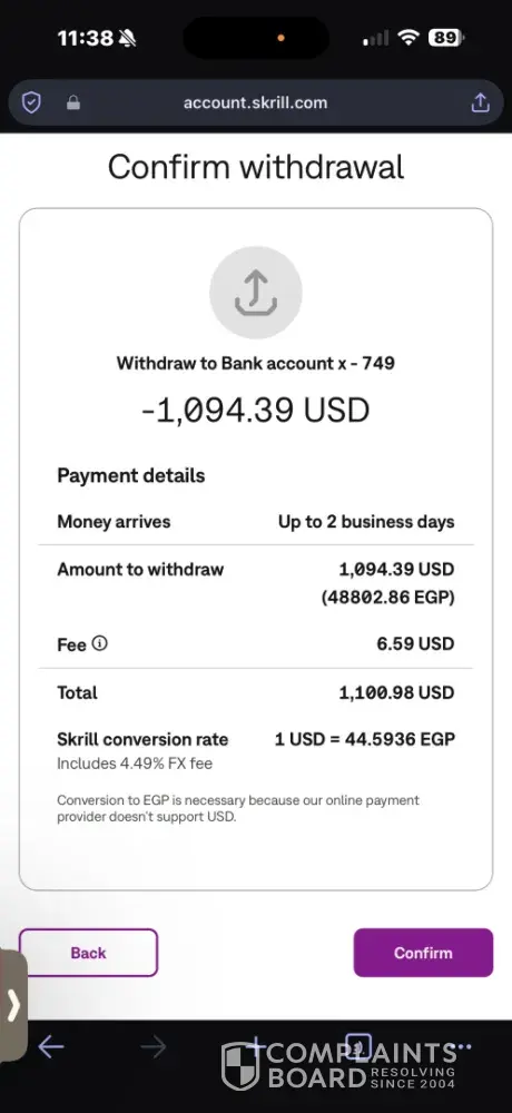 After depositing $10.55 into my Skrill account, I am unable to withdraw it. To help you better understand what kind of trick they use to prevent you from withdrawing your money, they simply set a withdrawal limit below what you deposited and a maximum amount above what you have, making it impossible to withdraw. Although I have verified my identity on the account using the required documents and been approved by the Skrill team, as well as sent an email complaining about what happened, the situation remains the same. I hope for a solution to this problem that has been going on for days.