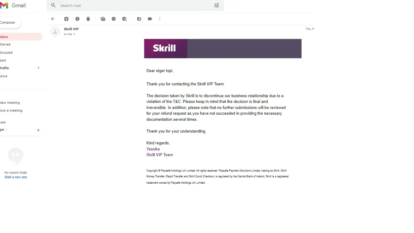 The decision taken by Skrill is to discontinue our business relationship due to a violation of the T&C. Please keep in mind that the decision is final and irreversible. In addition, please note that no further submissions will be reviewed for your refund request as you have not succeeded in providing the necessary documentation several times.