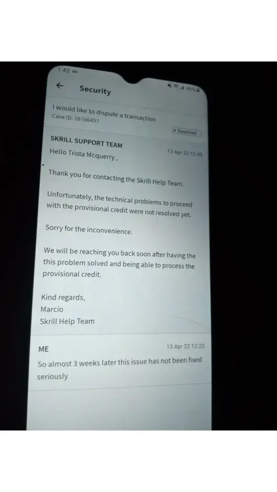 Skrill Unauthorized transaction was told provisional credit was added and it has not been