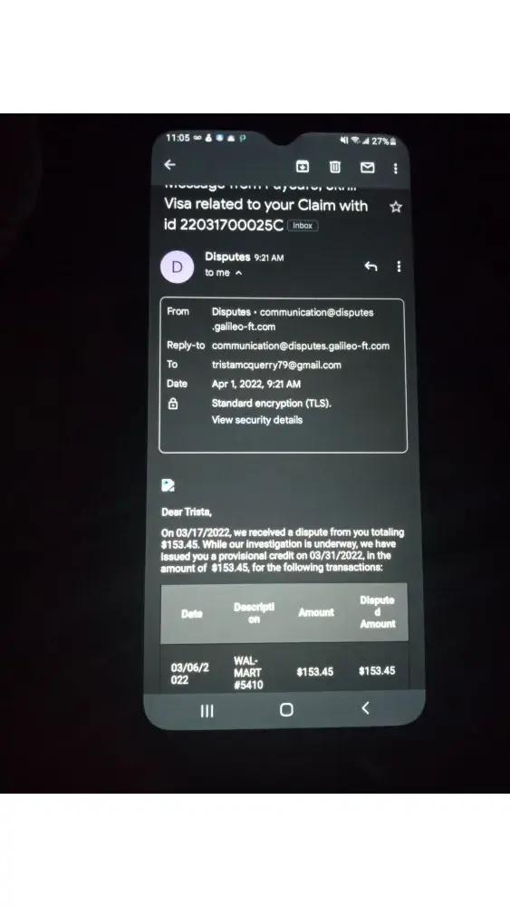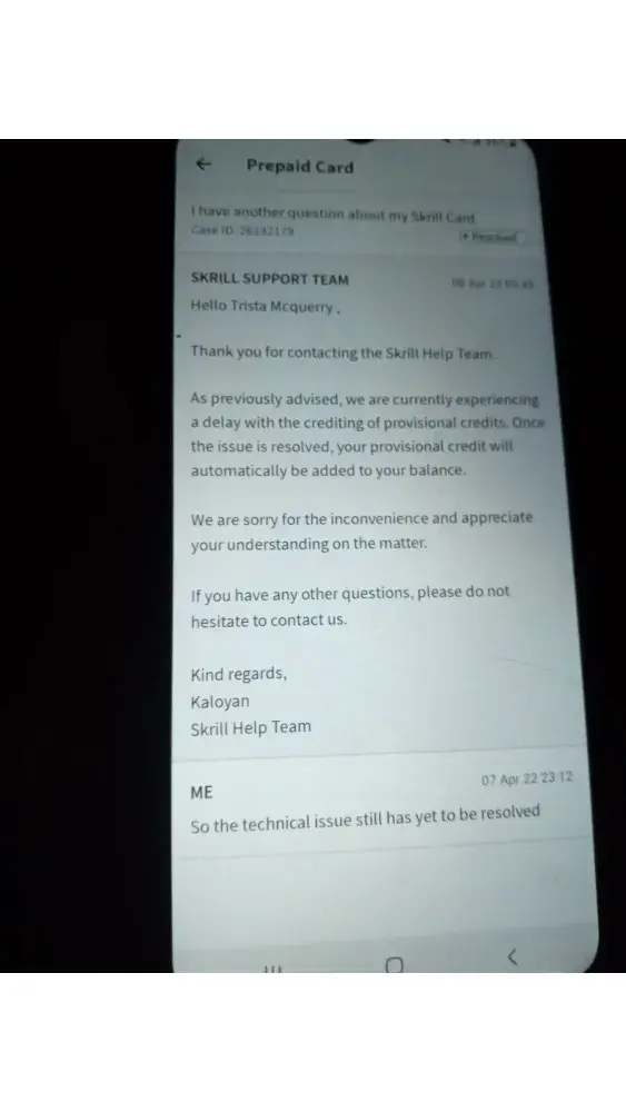 I filed unauthorized transaction dispute March 6,22 for the amount of 153.46 Walmart as my previous Skrill card was stolen . received an email March 31,22 saying they credited my account with provisional credit of 153.46 while they finish the investigation but they never added the credit now they keep saying they are having technical issues that is preventing this credit from being added.