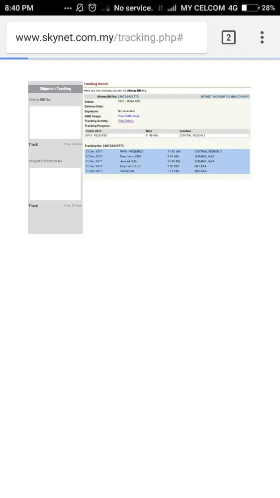 Ordered oven from l*z*d* and supposed to be delivered latest by 18/12/17, been checking out the tracking since 17/12 so the game of waiting started since Monday by 18/12 parcel was at cr1(Batu caves) on the 20/12 tried calling your branch no one answered..so frustrated, I would have tolerate if your staff informed any delay or problem with the parcel, very poor service by skynet
