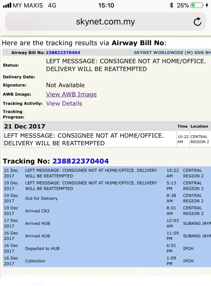 Today as on 18/12/17, I called sitiawan skynet office to get info about my parcel. They told me its out for today. Again out for for delivery? Isnt it weird enough the item has been out for delivery for 3 days?