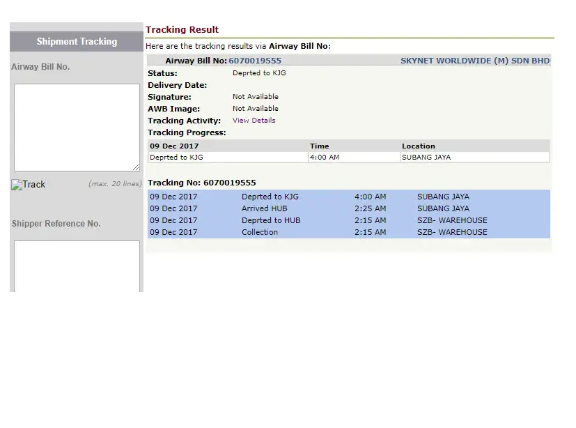 This is an international shipment from China to Malaysia. It was confirmed has reached Skynet as the last status of this parcel was on 9th Dec 2017. Parcel arrived warehouse and received at Hub - Subang Jaya and departed to Kajang Branch. HOWEVER! No more updates thereafter!