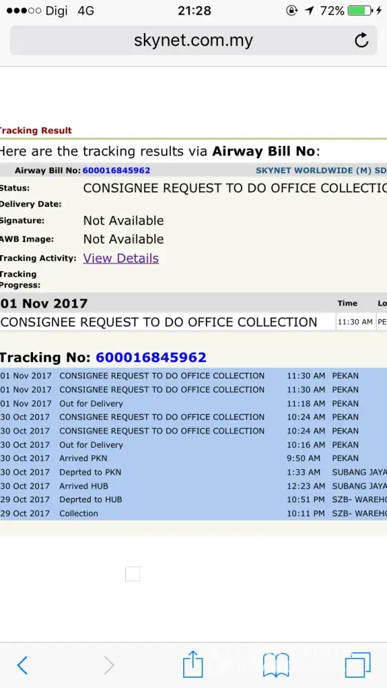 I did call SkyNet centre in Selangor few times but nobody answer the phone. The same thing happened when calling SkyNet Sg Petani. Yesterday, someone answered the phone and told there're too many parcels to deliver but have to wait due to limited transportation.