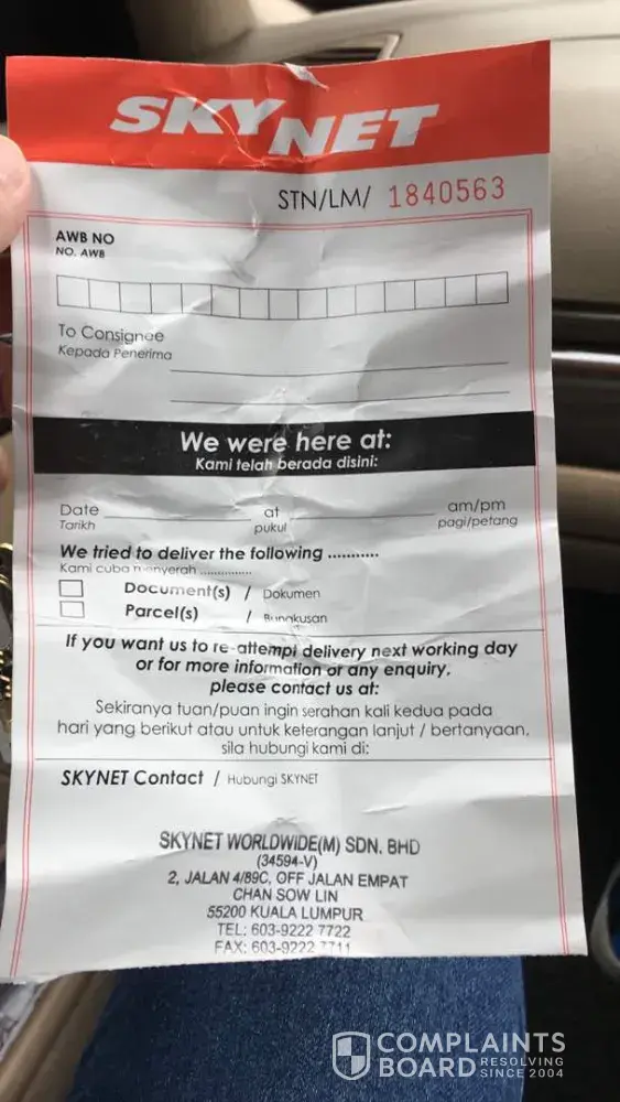 On 4/12/17 at 11:47am I received a call from [protected] your delivery man that he is at the address 36, Lorong Bandar 3, Seputeh, 58100 Kuala Lumpur. But at that time I was not at home and nobody is at home too to receive the parcel. Then your delivery man suggest to me that he will throw the parcel inside the house compound since it is a small item. I told him not too because I have big dogs inside. I ask him when can he come again and he said" I tak senang ada banyak barang lagi mau hantar tak tahu pukul berapa!" way of speaking not very friendly. I got very annoyed with his attitude and told him I will go collect the parcel at Skynet office. My mom purposely went back home to check whether any Skynet slip note was left inside the post box so she can collect on my behalf but only found one crumble Skynet slip note at the drainage grille without any written notes. My mom called your delivery man mobile again and ask why Skynet slip note was not left behind and why he throw away the Skynet slip note at the drainage grille. He replied that is not ours was other people slip note. He said because he managed to speak to the consignee and Skynet slip note not required. Is this true? Without the Skynet consignment number am I able to collect my parcel at your office in a smooth way? I don't think so, your collection counter will sure present me a "ANNOYED" expression because you have so many incoming parcel and how to check immediately! I have experienced with Skynet delivery and have no problem before. Please explained. Lastly I managed to get my consignment number after my mom asked him and she have to write it down herself.