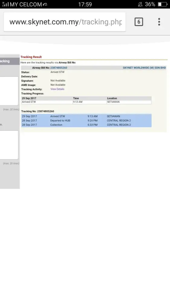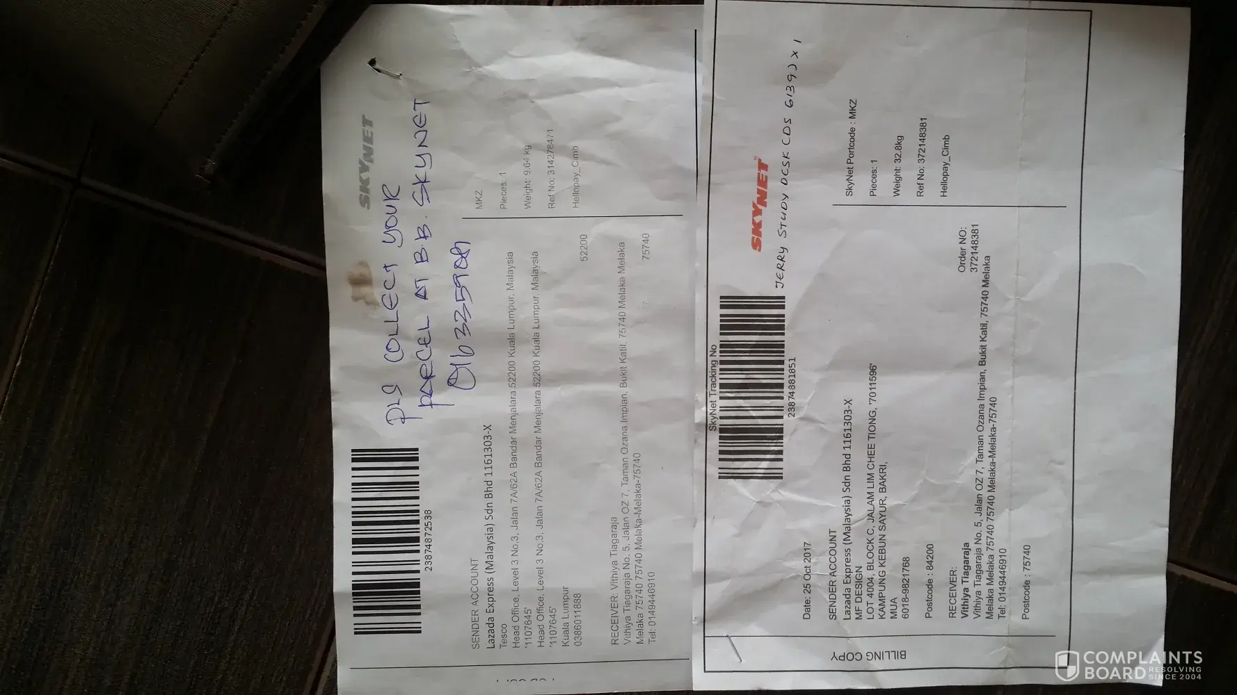 Assalamualaikum, saya nak File Complaint kpd Skynet, on 28 Sept 2017 saya ad beli barang di LAZADA, review barangan mngatakan barang akan smpai dalam 5 hari sahaja...jika beli 28 Sept, bermakna bermakna barang sy akan smpai 3 Oct 2017...memang itu yg dijanjikan...3 Oct 2017 barang sy masih belom smpai...4 Oct 2017 sy dpt email kata barang sy bru diposkn oleh syarikat courier ni...smpi harini 7 Oct 2017...sy masih belum menerima barang saya...tracking no. [protected]...saya cek dgn LAZADA yg memberitahu sy barang tu sudah berada di Skynet Sitiawan sejak 29 Sept 2017...servis courier apakah ini? Smpai harini saya masih belum terima barang saya...harap pihak tuan bole ambil tindakan.