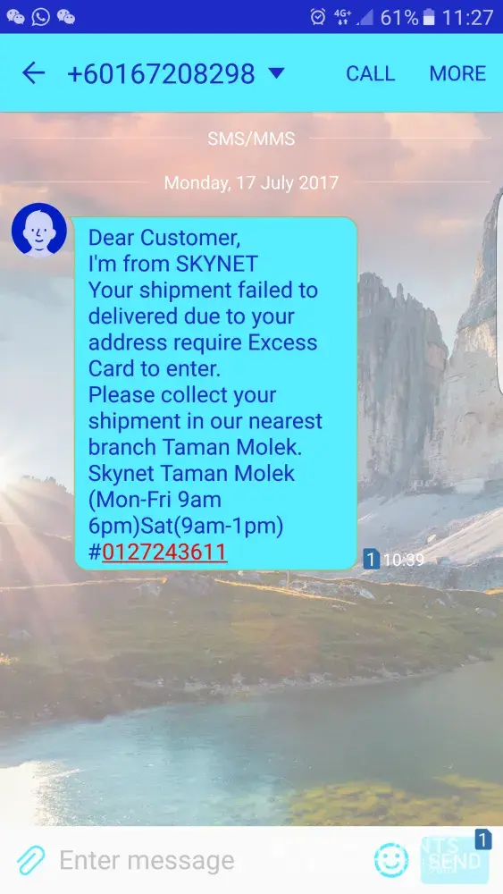 salam saya tak puas hati dgn layanan staff tuan/puan siap sms saya marah bagai . padahal barang sepatutnya smpai sabtu (08/07/2017) tp di sebabkan cuti halfday barang saya tak smpai . tu takpe saya tak marah . yg saya marah dorang call isnin saya time tu tengah memandu otw pergi kerja (confirm la tak angkat) then petang dlm pukul 1 dorang call dorang ckp tak hantar barang sbb saya tak angkat call dan alamat tak lengkap . saya bg alamat yg sama dekat postlaju dan gdex . okeyy jee hantar barang ni skynet tak tahu ke alamat padahal tempat org shopping ikut waze pon dh tahu . saya geram dgn sikap biadap staff tuan/puan siap sms ayat kurang ajar kata kata sindir, dia kata nak hantar esok then saya letak sbb saya marah dh lama sangat tunggu sbb dlm tu makanan nak masak mlm ni, pandai pulak call banyak kali, pagi tadi call sekali jer mana nak perasan hahahahahahah well first and last i guna perkhidmatan skynet . all the best ! [protected] no staff u yg biadap tu . normal la customer marah sbb barang tak smpai ikut ontime . dia nak marah jugak asal patutnya sms mintak maaf ni sms naik kan darah !