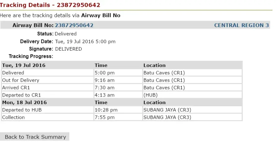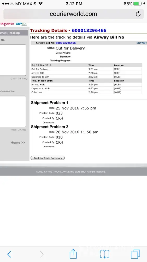 My AWB [protected] which shown 'out delivery' on 05.12.16 and 06.12.16 on the tracking result but I have received nothing or a call from the Skynet . It has wasted someone time to wait at home because I trusted what they meant by 'out delivery'. On 07.12.16, I have managed to request Penang island branch to change receiver address in the morning where it is nearer and easy to find and in the afternoon I did confirm with them that the parcel is on the way although the tracking result already shown 'out delivery' status. At last, I did receive nothing and they said run out of time (tak sempat). 3 days 'tak sempat'! If not able to handle too many parcels, please la don't take the orders and let other companies to handle it. Keep loading and unloading from lorry will only make the goods inside the parcel damaged. Tq!