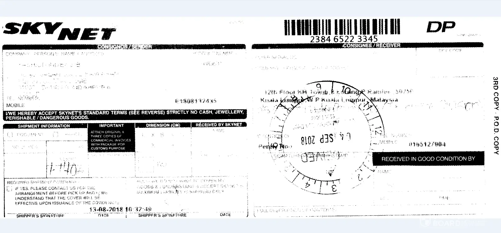 I was very angry with skynet deliver service.My parcel stated was showing delivered since 4/9/18 but I did not receive any parcel until today.I was then checked with the parcel sender and they told me that the parcel had been received by the receiver by showing me the received chop on the tracking note! Honestly I had checked the receptionist / guardhouse they told me that there was no parcel for me and the receiver chop was not from my building address.Now I was lost my parcel and lost my money as well! My contact number was stated on the consignment note and nobody call me for confirm address if the postman is not sure about the address.I need skynet to give me an explain on this.I was very disappointed and need an explain from skynet.I need my parcel back!