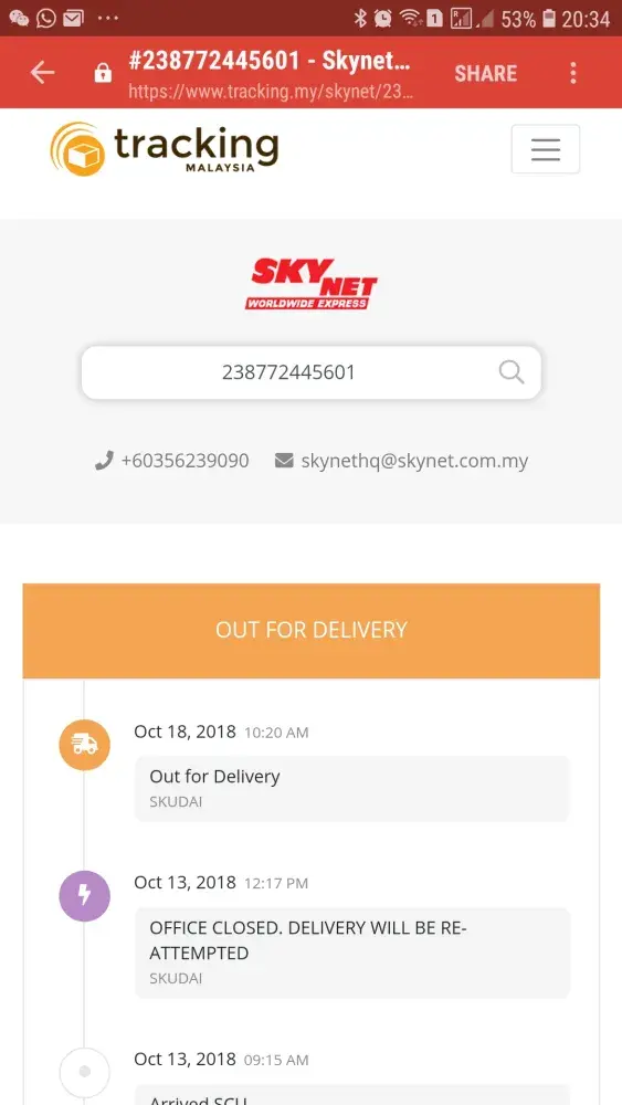 On Oct 10 (a weekday)they did not attempt to send it to the office address which was opened but to call me instead as mentioned by En Sofian from Skynet Warehouse. I was on an island off Mersing and did not receive the call…due to that you have sent it back to the seller.