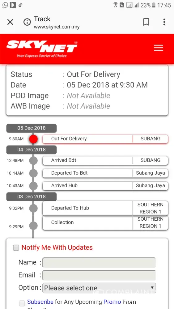Checked the tracking status it appeared "out of delivery", but they never contact customer if parcel cannot on time delivery to customer. Just let customer wait when contacted customer service george town branch.