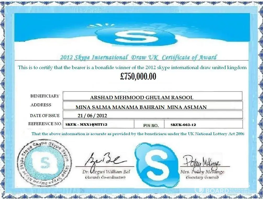 sir, i have received mail in the name of skype office UK they told me that i have win the prize and send to me copy of prize win certificate, copy of check and copy of affidavit (copies attached). sir i am a very poor man naturally i was very happy to see this but also thinking that may be some body cheat me. so pls can you confirm me that is it correct or not because they using the name of your barr