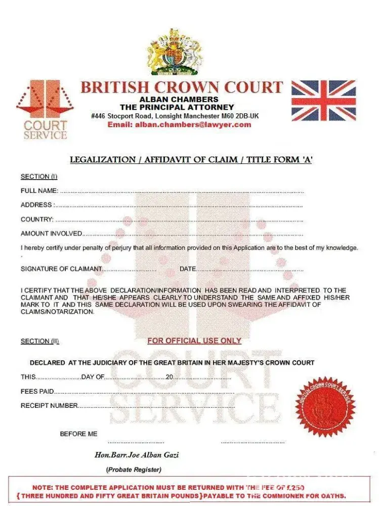 I am in receipt of your e-mail in which you have indicated your interest in our legal services. The Affidavit Of Claims is a document required by most Financial Institutions here in UK for the Legalization of Claims.
