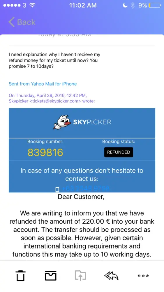 I booked my flight in skypicker online from kuala lumpur to dubai! Once the booking was made, they wrote me back to add additional payment cause the price online is higher and the flight is not available! They ask me for additional 86€, so that they will find another flight for me. I refused cause that's not actually my fault because that's is the price online and the option was not accurate in my time availability. They told me to refund my money back and they said I will be able claim it 7 to 10days! I waited for 11days! Still I haven't receive the refund till now! They said that the refund money was voided by their financial office and now they ask me for so many questions and many things to make the refund? Where do I have to go for this matter?