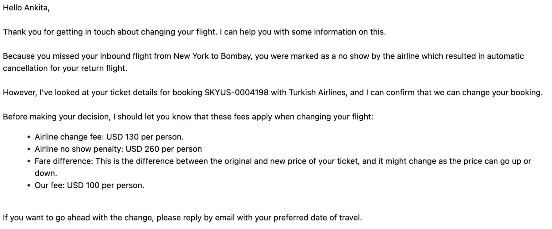 Please be informed that because you missed your inbound flight from New York to Bombay, you were marked as a no-show by the airline which resulted in the automatic cancellation of your return flight.