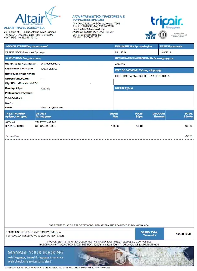 I booked a flight from Cario to Melbourne for the 13/08/2018. I booked through Skyscanner with tripair. Flight number:QF 8924 ticket number: [protected]