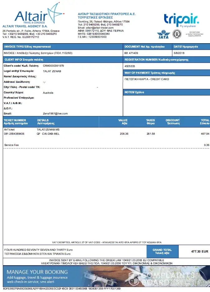 The ticket i booked was a total of 477.30 EUR ($774.19 AUD). However there was an error and mistake on behalf of tripair. After contacting them many times, having rude customer service i finally got through to them. They agreed to give me a refund of the amount. However they did not refund me the full amount. We agreed that tripair would take 30 EURO as a cancellation fee. They refunded me 404.85 EUR ($654.74 AUD). This is incorrect as there is 43 EUR ( $70.00) missing. We contacted them many times but they have told us this is correct when it clearly is not. If you have a look at the attached documents you will see there is a change in the cost of the value of the ticket is 25 EURO more and additional tax added on (7.58 EURO). They changed me more on my first ticket but when coming to get a refund the ticket price is changed to a lower amount so i get less refund back. This is unfair and i will be taking this further to consumer affairs if not resolved my skyscanner. tripair refuses to deal with this issue and are scamming me. Skyscanner is liable to this as i booked via your company.