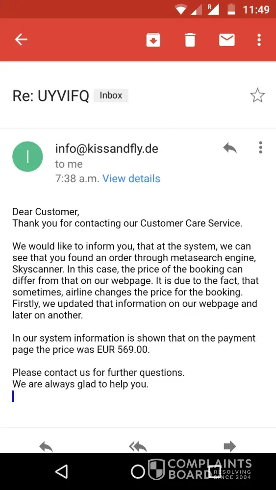 Skyscanner provides no contact email on their website for complaints (like edreams you click on the link and it does nothing or takes you back to the start - so you make no progress and give up).