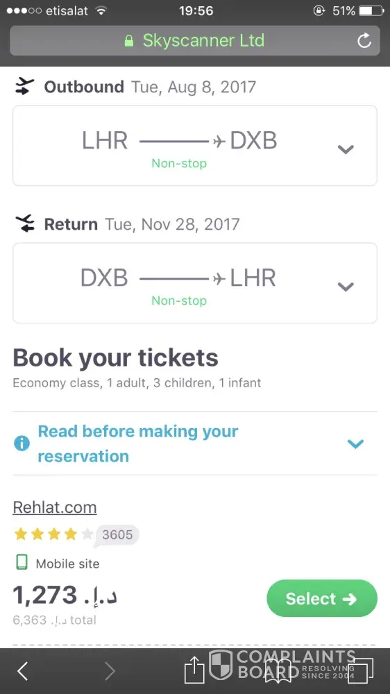 I booked an Qantas flight through your website, being directed to Rehlat. They took my payment of 6, 490AED then immediately told me my booking was unsuccessful. I called them asking what the problem was and they said the tickets were no longer available. I now had the choice to either pay an extra 1, 100AED and fly with British Airways or cancel completely and wait 48hrs+ for my money back. In the meantime though I couldn't book further flights as I needed that money back first. I complained to Rehlat many times but they kept disconnecting my phone call. After 2 hours, I searched the flights on Skyscanner again and 6 new flights with Emirates, operated by Qantas (including my original booking) were now being offered with Rehlat for the same price that I had already paid (6, 490AED). I called Rehlat again and asked them to change me onto one of these flights instead. They told me I couldn't have any of these flights as they cannot change the airline. I asked how they were able to offer me the British Airways flight for 1, 100AED extra and not the Emirates flight for the same price I had already paid (bare in mind that one of these Emirates flights was other exact same flight I had booked with them already). They told me they can move to BA because it is a different price but can't move me to Emirates because there was no increase in the cost. Basically a complete scam to get extra money off me. Anyway, I then had to go and book the flight elsewhere in the end, at a cost now of 7, 555AED. I am absolutely disgusted that Skyscanner is using companies like this. How are they able to take money without confirming availability first and then refuse to put me on a flight of the same cost but offer a much more expensive one. I have not received my refund yet, I have had to borrow the 7, 555AED to book my new flight and have incurred extra costs of 1, 065AED, yet these flights are still on Skyscanner for the original price I paid. What will you do about this? I originally booked my flight with Rehlat at 14:05 today. I have attached a picture taken at 19:56 today showing the ticket at the origins price of 6, 363AED (they add on 127AED to use a credit card, also disgusting). Regards Lisa