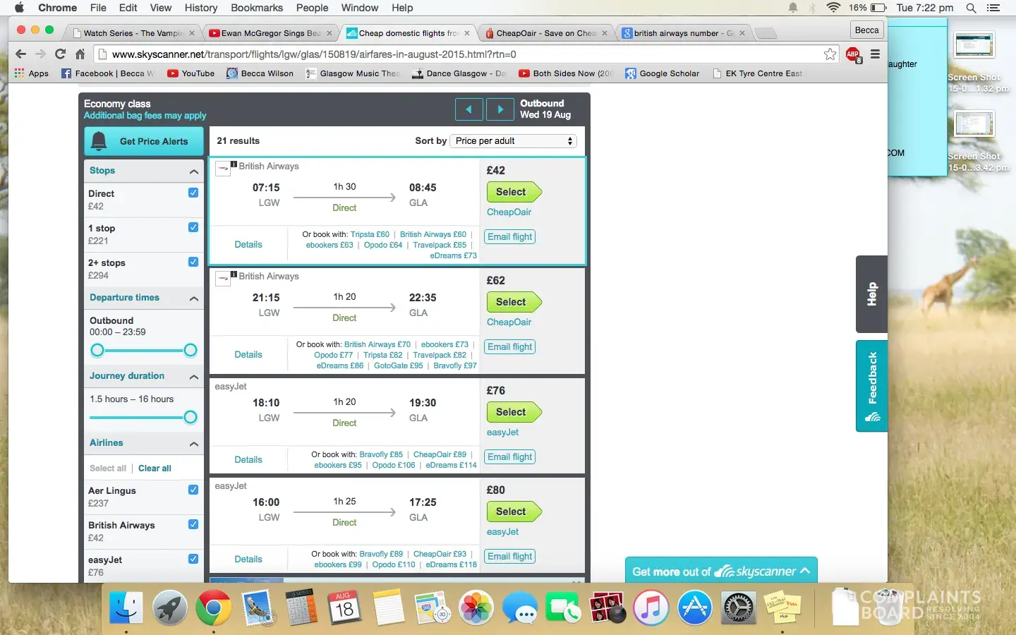 Yesterday evening I visited Skyscanner to book at flight from London Gatwick to Glasgow. A flight was displayed for £42, departing at 7:15am with only 2 seats remaining, British Airways. As I went through the booking process and added all my details it still confirmed that there were still 2 seats available. However when I reached the final confirmation page the payment didn’t go through as the flight was now “unavailable”. I was then offered a promotional code of £20 to price match the next flight from £62 to £42 but there was nowhere to enter the code at checkout so I called the company that I had been redirected to, CheapOair. I then reached a woman named Roseanne who was incredibly rude and then told me that the flight had double in price and was over £80. This came as quite a shock as the website still said £42 with 2 seats remaining. Whilst trying to understand why the flight had doubled in price, Roseanne then went on to verbally abuse me and lecture me on how I shouldn’t be booking a flight the day before. If this is the case then your company shouldn’t offer such a service. I had to hold the phone away from my ear whilst she was shouting at me and my mother could hear her from the other side of the room. To say the least this was an appalling and unprofessional way to deal with a customer query.