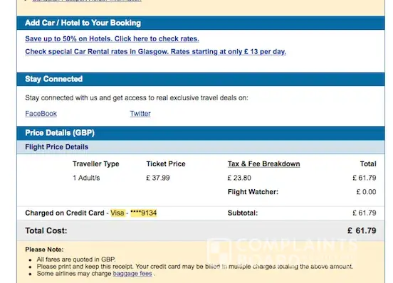 I then reloaded the Skyscanner page to see if there was any change in price on the website and there wasn’t. It was still advertising the flight for £42 at 7:15am with British Airways. I decided to go through the booking again to see if anything had changed and throughout the whole process the price was £42, all the way to the confirmation page. It finally confirmed at £42 but due to the previous issues with this order I checked to see how much I had been charged and to my absolute disgust I had been charged £61.79 instead of £42. I don’t understand how a price can increase after the payment has been processed.