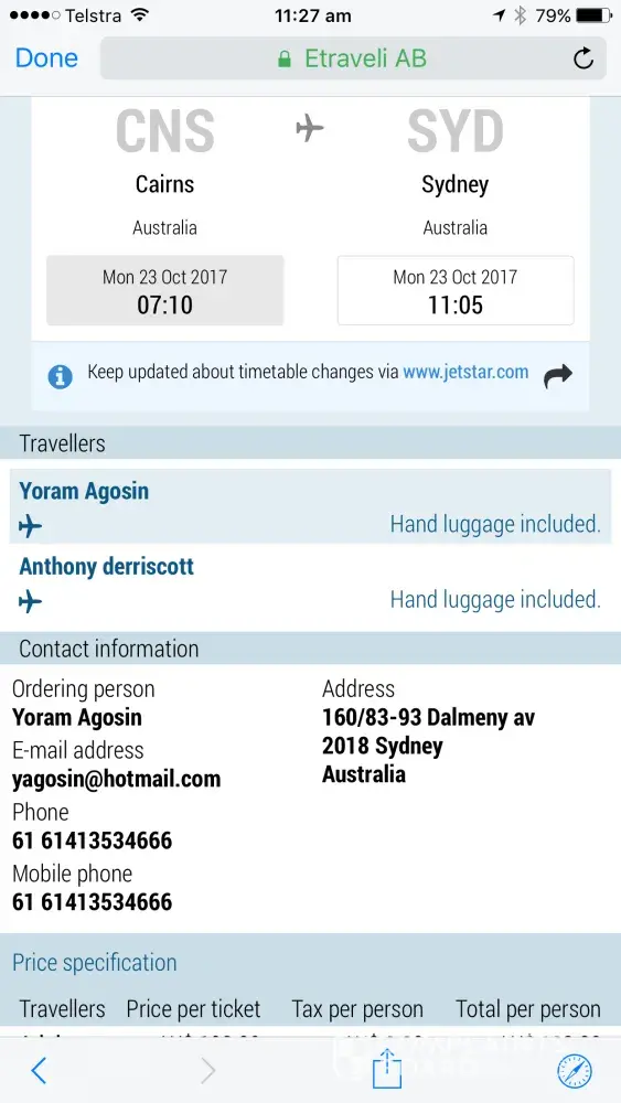 I just book a flight from cairns to Sydney on the 23/10 on my name using your site on jet star at 7 10 am