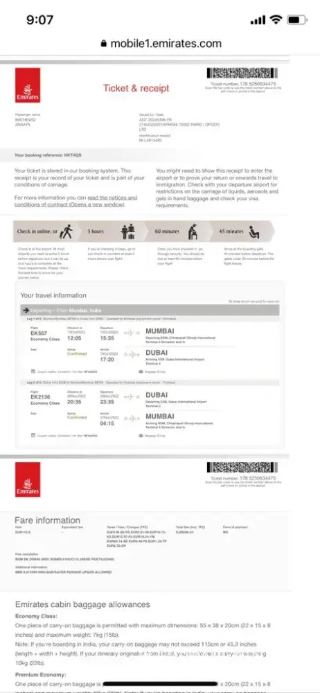 Emirates Booking Ref: HKT4QS
