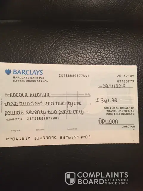 When this didn't happen, I sent an email to Travelup in October 2019 asking for the refund and as I no longer had the credit card used to buy the tickets, I sent my home address details as requested and was told that I would receive payment within 5 working days. When that did not happen, I sent an email to Travelup again, in November 2019 saying I had not been paid and was told by Travelup to check with my bank. I asked for clarification as to the refund process as I thought I would receive a cheque at my address but was again told to check with my bank!