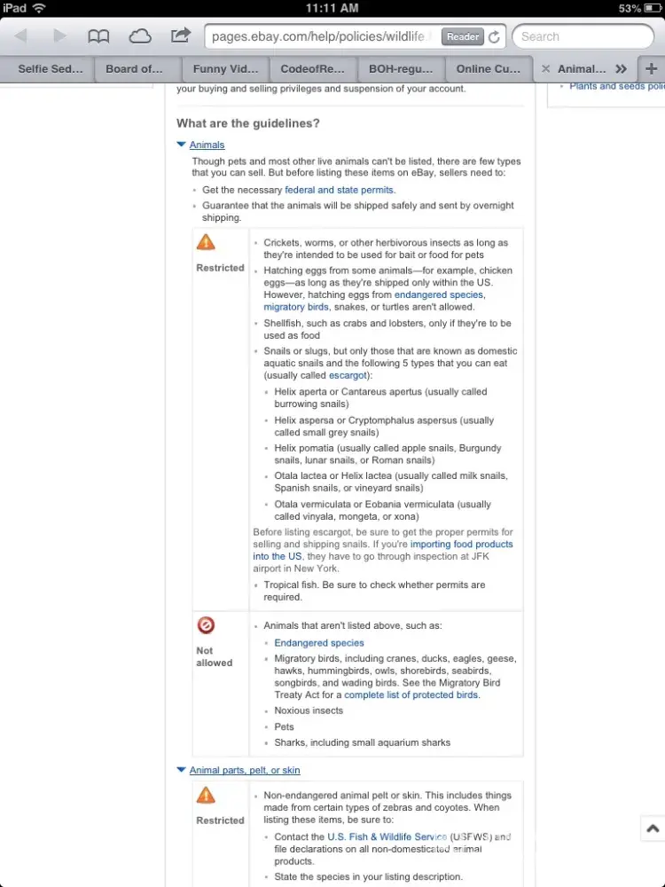 Another thing that is really confusing me is who and why eBay keeps being mentioned. No one can sell a live animal on eBay. So how is it that that is stated over and over again. If any of the above posters can clarify that it would be greatly appreciated, because either someone is lying or very mistaken. I am posting a screen shot of the eBay rules just to back up what I am saying. Just as anyone claiming factual info should.