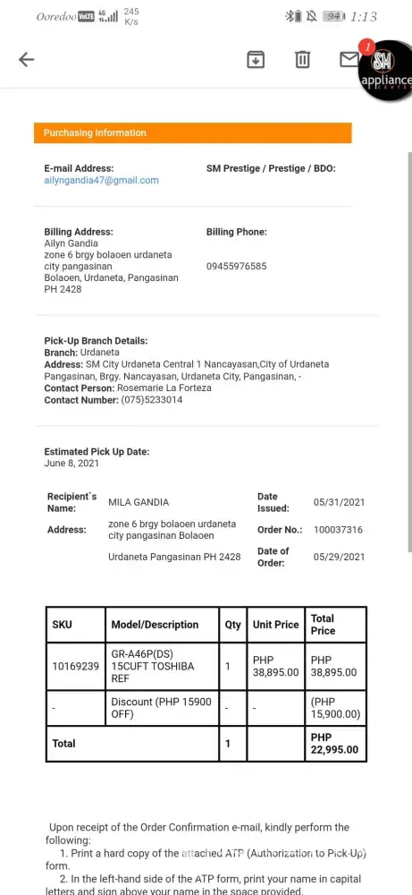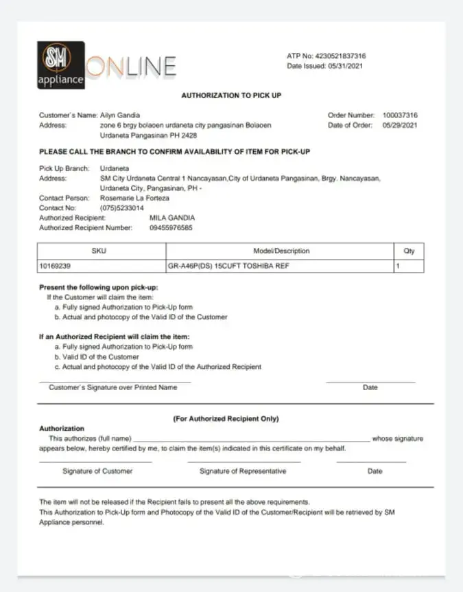 Date of Purchased ...05/29/2021 estimated pickup 07/08/2021 order no, , , ...[protected] item Toshiba ref item model gr-a46p(ds), , , , , , , name of customer ailyn gandia pickup location, , , , , , , , , SM appliance center Urdaneta city pangasinan resolution, , , , , , , , , , I wanna locate my order and transfer it expedite.?