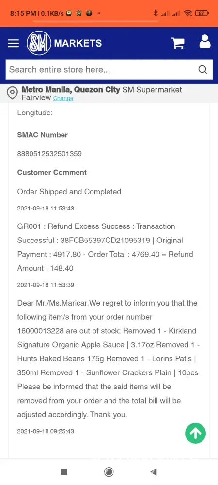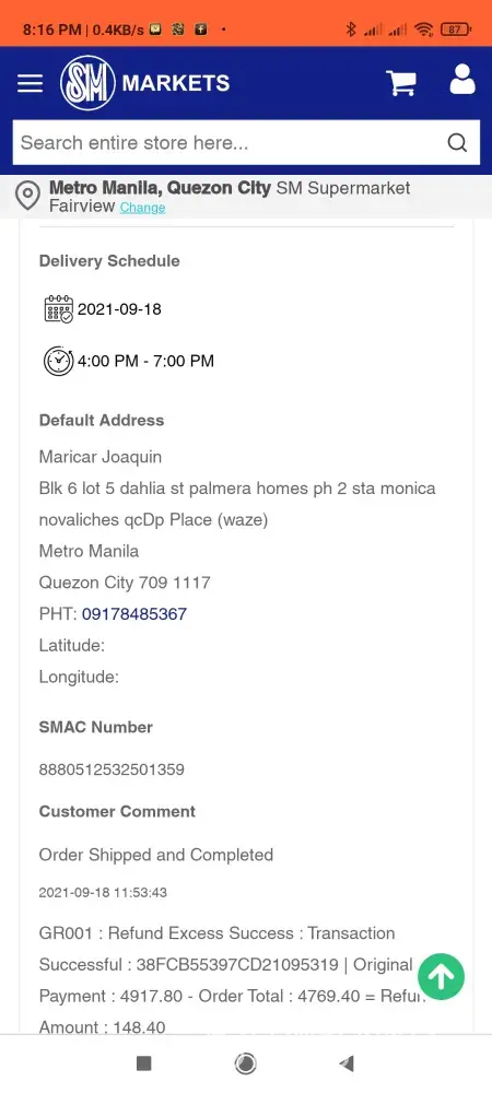 I ordered via online at sm markets website particularly sn supermarket fairview. When I ordered at around late in the morning today sept 18 2021, delivery was scheduled around 4 to 7 pm. I paid already thru gcash. Until now, nothing was delivered. But in the sm website, it says it is complete and been refunded of some items that were out of stock. So how come it was complete, wherein none were delivered. I also indicate there to please call or msg me. None were done. So what will I do? I need a refund asap. I am limiting myself to go to the supermarket because of covid, now I have to make some time to go to ur store tomorrow.