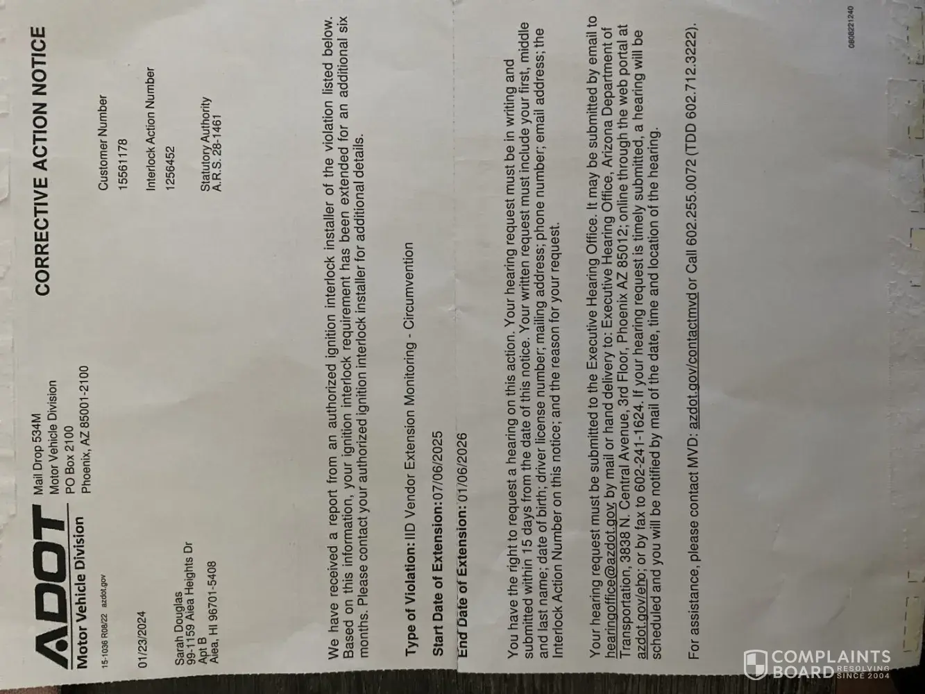 On January 27th, I had the device installed in my vehicle and began receiving my calibrations each month. On February 3, 2022, I received an email indicating that one of my Driver's License forms had not been processed or forwarded to the appropriate agency due to an issue with the vendor's installation. I informed them that the paperwork should have been processed on January 27th, as that was the installation date. I even witnessed the technician fax all the documents during the installation.