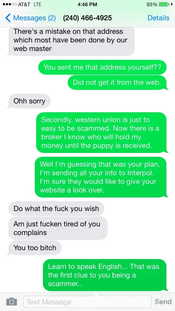 James or Jenny contacted me after I inquired about purchasing a puppy from them. They were pushy at first and then changed tactics to friendly and supportive and even concerned. They kept pushing for western union transfer and their address they gave me personally via text was fake, it's an intersection with no houses in the area. Closest one is about a mile away. I did not send the money but offered them to use a broker who would hold the money until the puppy was received, they sent severely rude comments and then quit responding.