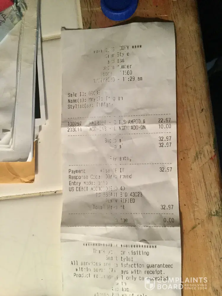 On 6/4 I went to waverly IA smartstyle asked for black w blond highlights I ended up with black roots blonde middle and orange bottom FROM THE MANIGER janice I spent 4hrs at cedar falls smart style getting it fixed by maresa(best hair stylist ever) all in all cost me almost $500 and 2 days just to get get what I asked for no refund horrible company