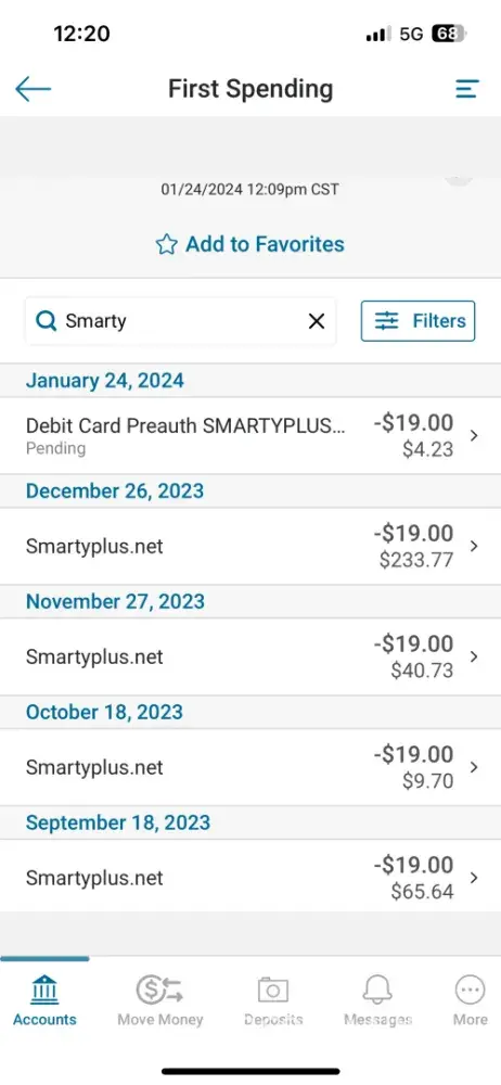 I have had five $19.00 payment taken out of each of my checks since November and have never noticed and I didn’t even know what smartyplus was untill I looked it up on Google to resolve my problem. I never made an account so there is no way of cancelling this payment. I would like all my money back plus the $3 taken out also.