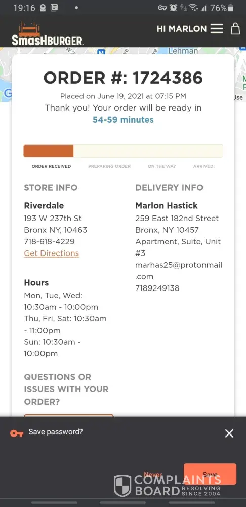 Called General Mgr (Raj?) at Smashburger, was told I needed to talk with Uber. (He said he would pass this along to his cooks)
