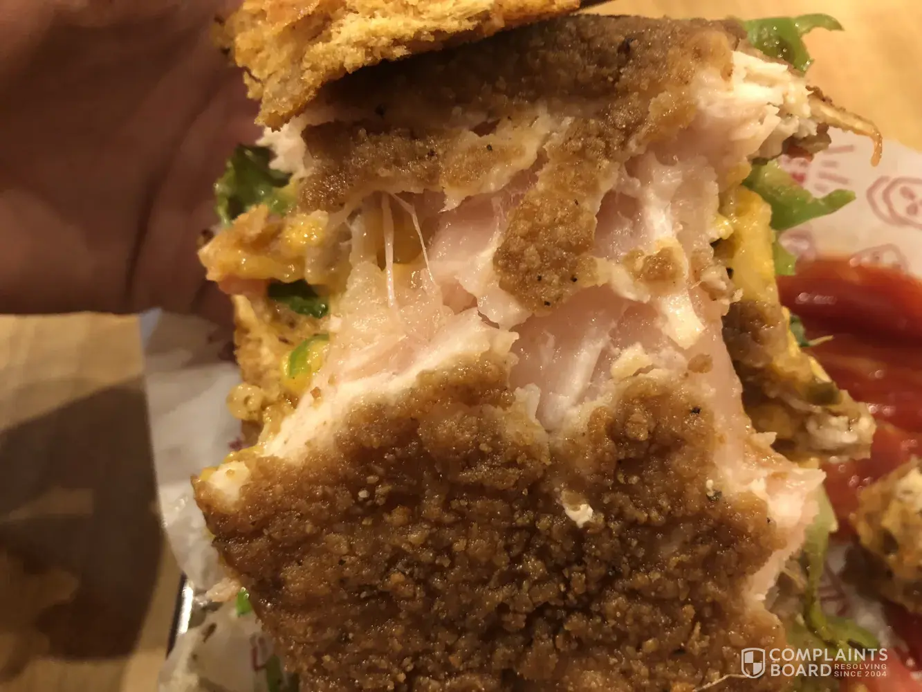 After several attempts of calling to the Smashburger customer service center and recorded messages on voicemail, it never got answered and returned the call. So I want to file the complaint here via online. On November 29th, 2017, I went to my local Smashburger restaurant to order "Colorado" crispy chicken sandwich. I ordered it then waited for about 10 min which is very normal. After my first bite of the sandwich, I suddenly noticed a raw chicken meat. I tore the sandwich apart in half and revealed that most of inside the chicken meat is still raw. I showed it to the shift leader guy, Jason. He was like oh sorry about it and did nothing afterward. I was expected to get full refund or coupon for free meal but nothing! I feel like the headquarter need to know about this but don't understand why they went being unresponsive and helpless? My words must be heard in this kind of situation of serving a raw chicken to customer. I took pictures of my meal as evidence.