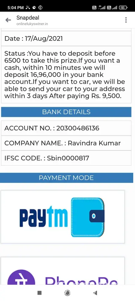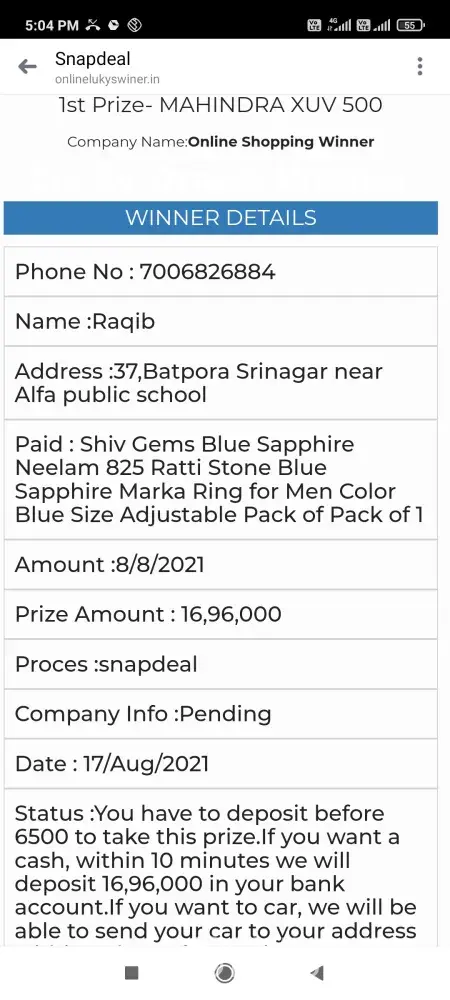 I got message from snapdeal that I have won prize in lucky draw from snapdeal but I didn't get prize and the prize was mahindra xuv 500 or 1960000 and snapdeal asked me to pay 6500 and I paid 7000 on behalf of snapdeal niether I got prize nor my money 7000 back snapdeal customer care and company employees are using bad language snapdeal is totally fraud license of snapdeal should be cancelled because they sell duplicate products at high prizes I request Mr Narendra mohdhi ji to cancel the license of snapdeal...