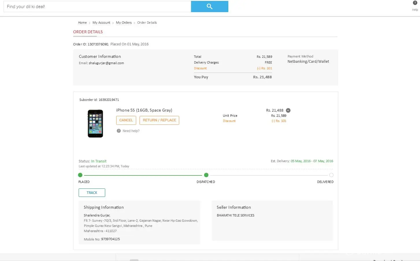 Order Placed on 1-May, IPhone 5S with snap deal.