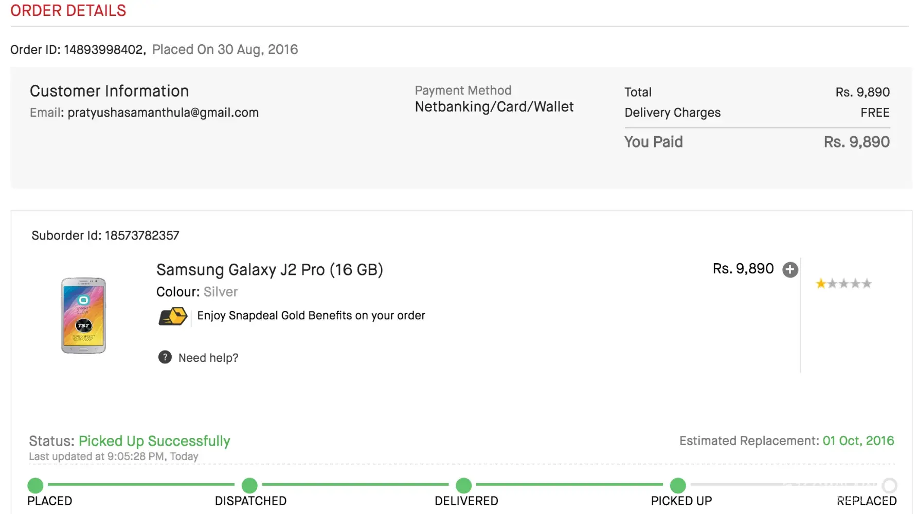 We request you to share your order details or complaint number to help you out in the best possible way. Kindly drop us an email on writetous@snapdeal.com with these details. We assure you all possible help.