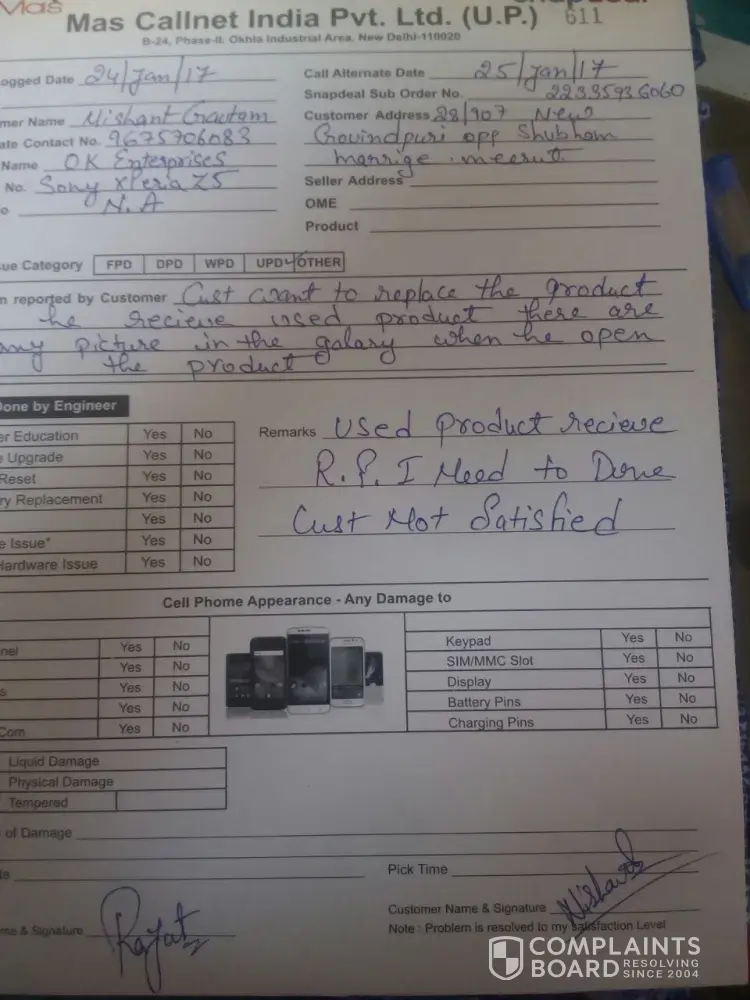 I want to share my concern with you that i bought a mobile (sony xperia z5, Order ID- [protected] Placed on 16 January 2017) from snapdeal, when i recieved my order and checked it then i came to know that this product is not new this is old product because it has many photos (one year old) in its album section & also find 145mb data used by any user found in settings in data used option and found also the mismatch of the acceseries of it with dirty box & packeging and than i complaint this issue to snapdeal then they send a engineer to check my issue at my home, he checked it and made a jobsheet for me in which he mentioned that the customer faced a genuine issue after that my product got picked up by snapdeal for quality check and they remarked on it that my issue is not real and told me that you have to pick up the same product, i denied but they did not listen to me and send me the same product, i again checked it and found the same issue in it then i called to snapdeal and told everything after that they told me that they can not do anything for me in this regarding. i wanted to refund or replace it now but they are not helping me.