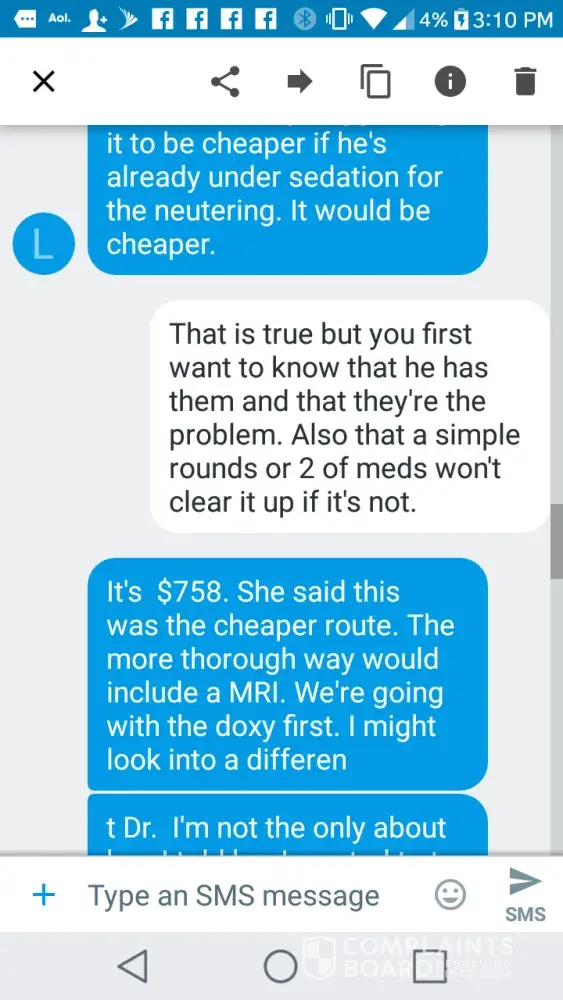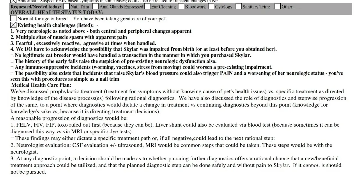 Because my claim has been doubted, because Sky's vets and I know that I am telling the truth, and because I have not had any success in attaching on Complaints Board the complete pdf's of the vet reports, I now am attaching a screenshot of the summary from Deb Mitchell, DVM [Knollwood Animal Hosp.], who spent 2.5 hours evaluating Sky on 08.18. Benito Comito, DVM Neurologist's report will be separate post.