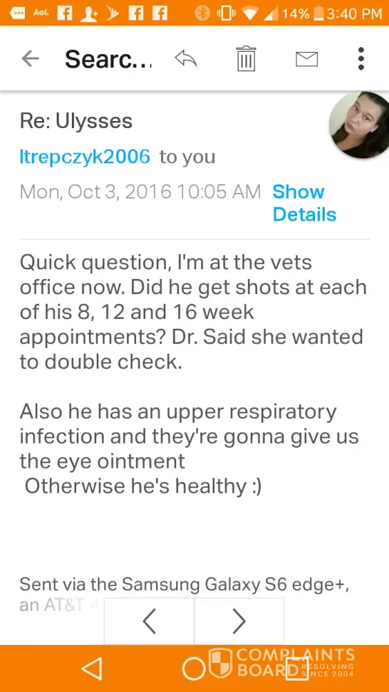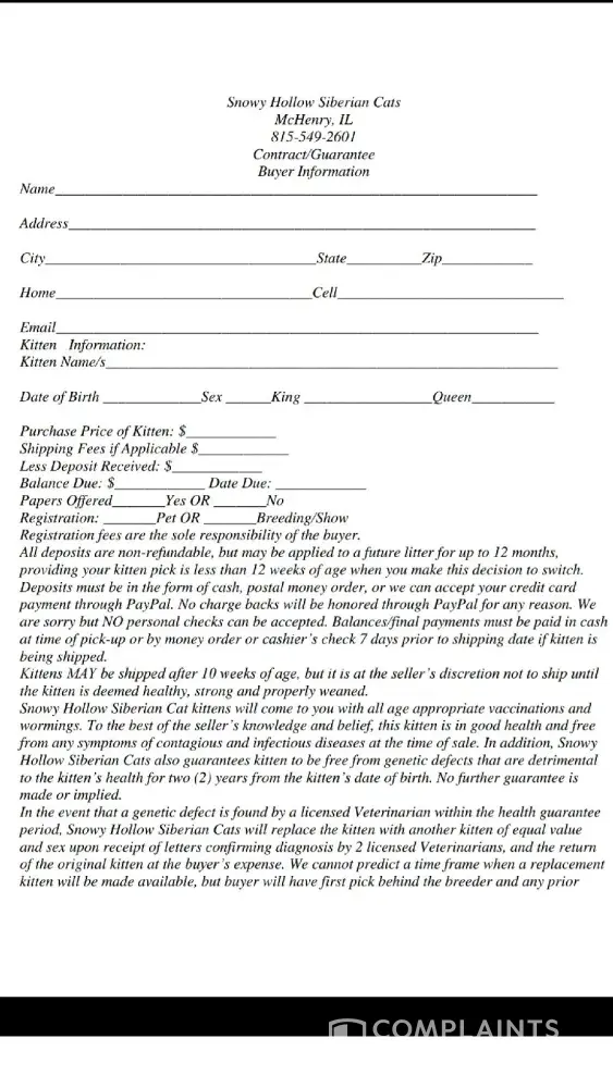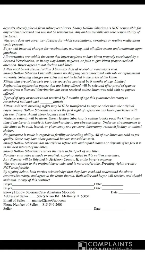 There is a reason why there are complaints here and on other places. There are several unsatisfied customers. There are sick kittens. And now, we have a kitten who died. These complaints are there to help other consumers. It is the responsibility of the breeder to make sure their kittens are healthy. These cats cost a lot of money so the expectation is there. We are not colluding and ganging up on this breeder, we are just three customers who have complaints. Maybe Anastasia should have handled the situation better. Taken responsibility. Stayed on top of what was going on. In my experience, where there is smoke, there is fire. Any prospective buyers need to take these complaints seriously. Honestly there are so many Siberian breeders out there now. You can be picky. Steer clear. Anastasia's response should be evidence enough.