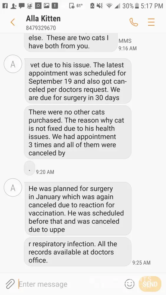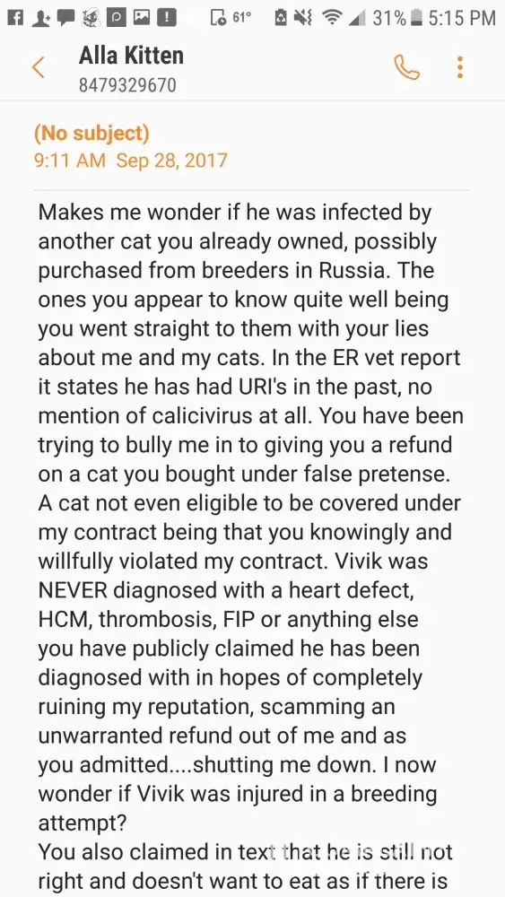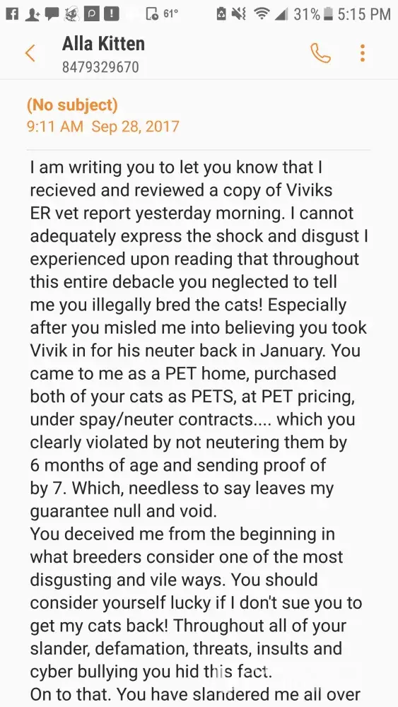 I feel like I’ve made my point here. I’ve pointed out your lack of diagnoses to your “claims” and I’ve also pointed out that your complaints and demands are about things that are not covered on the contracts you signed on your kittens you’ve purchased. The information Anastasia has speaks for itself. She has all the communications with the 3 of you that show she has upheld every aspect of her end of her contract and guarantee. You don’t get to buy a kitten, sign a contract agreeing to terms then try to change those terms after...such as demanding to keep a kitten and receive a refund...demanding a breeder to pay for tests and an illness that isn’t covered in the guarantee...not spaying/neutering the cats you recieve and then expecting your contract to be honored when you clearly didn’t honor your end of it. The amount of entitlement you threw women have is disgusting. Take responsibility for your actions, decisions, purchases and actually READ the extent of the contracts you signed. The breeder has completely upheld her end...I cannot say the same for you. This thread actually is a good warning...a warning to other breeders not to deal with you and other buyers like you. I feel extremely sorry for Anastasia and the harassment and bullying and irrational demands you have put through. YOU all should be ashamed of yourselves!