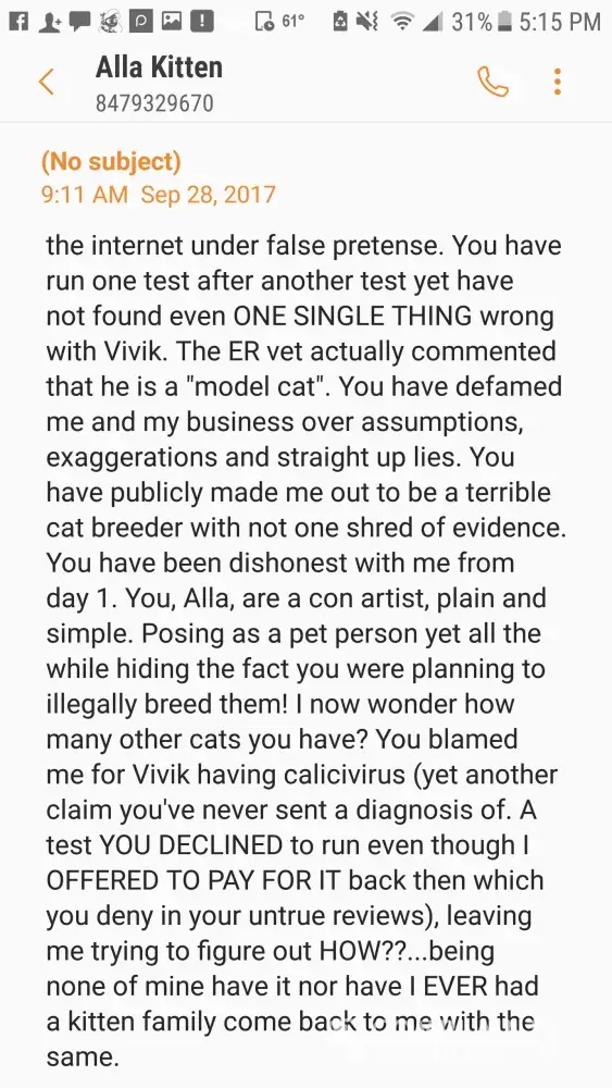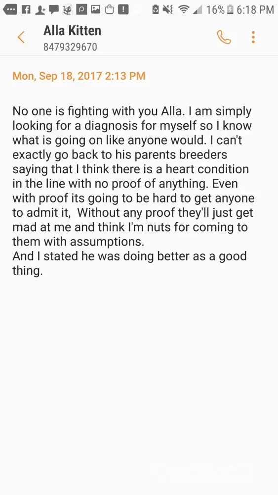 I am so sorry that your little kitten is so sick. When she saw my reviews she was so mad and kept going on and on about how I was hurting her and her family with my negative reviews. It is so messed up that she is trying to scam people, but also that these cats are obviously not well taken care of. I hope your kitty gets better. I think you posted on my Facebook review, I could not respond as she has made it so I could not. She is a horrible breeder. I