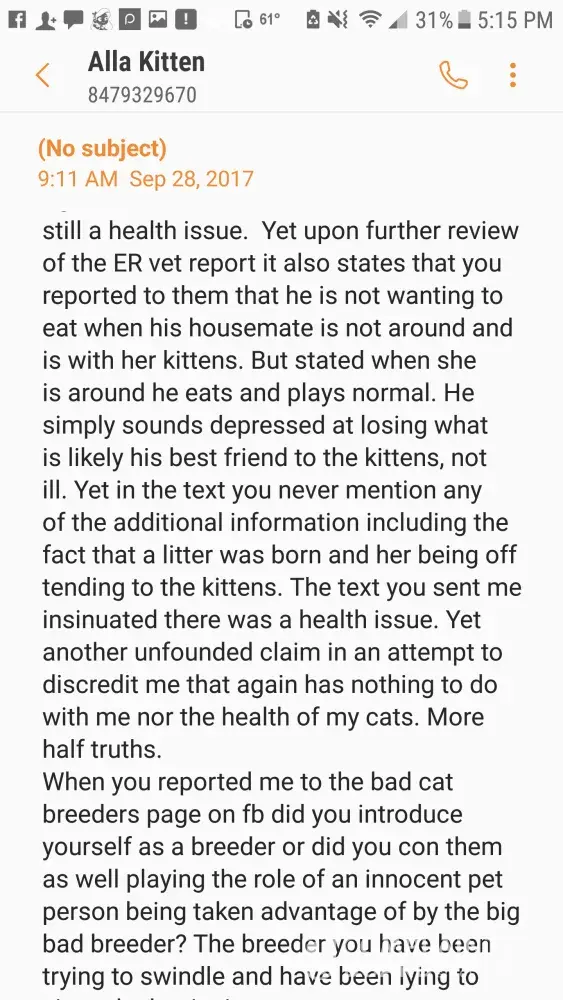 Grow up and take responsibility for your lack of research! I am always amazed at how stupid people can be when impulse buying. If this kitten was sick when you met with her then why did you still go through with the transaction? Did you even read your contract to see what it covers? Was upper respiratory infections in there? I’m guessing not...You're trying to place blame on a breeder for a kitten bought being sick when you visibly saw it sick. That’s like buying a blue shirt then getting home and being mad it’s blue! You're probably one of those fat house wives with nothing better to do than sit in front of your computer all day looking for some unknowing merchant (in this case, a breeder) to chew up and spit out all over the world wide web. G-d help those poor fools who don't please you in every way. If this breeder is smart she would get every communication with your types in writing!