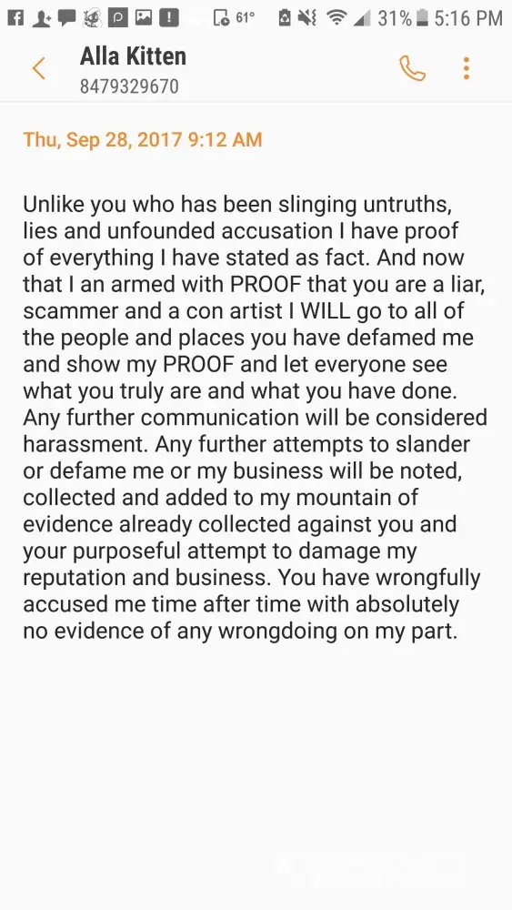 Due to the severity of the outrageous claims against my business and abuse i have endured I am currently seeking out legal counsel to address the severity of the situation.