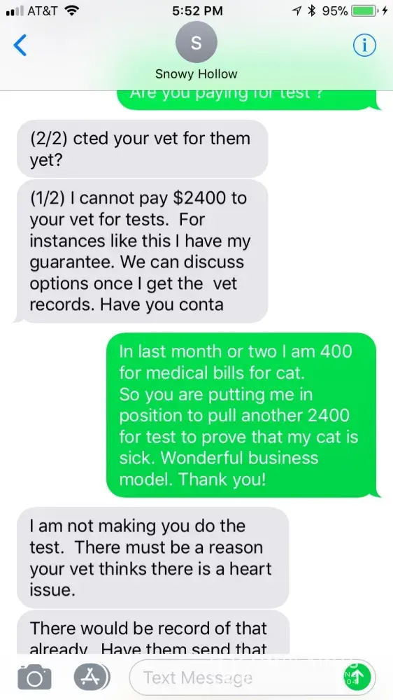 I didn’t ask for anything. Ask Anastasia to include at least one message where I asked for warranty. I asked for her to test her cats and to cover test that cost 2400 that she requested. Again I am not breeding cats.