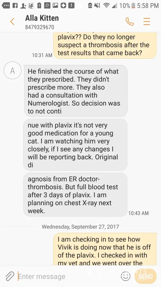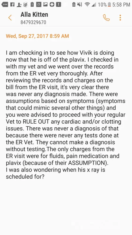 Anastasia dear, as I can see nothing is your responsibility. So vet misunderstood me when I was talking about cat being sick as a kitten, you have updated report what is your excuse now ? So you are saying I am trying to take your business away from you and that why I am doing this ? Or you are saying I took a healthy full of energy cat to ER on the middle of the night just for fun ? Or you saying I asked for warranty or to do tests that ER doctor suggested ? Or you are saying that your doctor prescribed steroids together with plavix was a right thing to do ? Or you are saying I had nothing better to do than taking 3 days off and run around vet's to make sure cat is ok ? I am confused, maybe this is due to your friend Jen suggesting I need to brush up on my English.