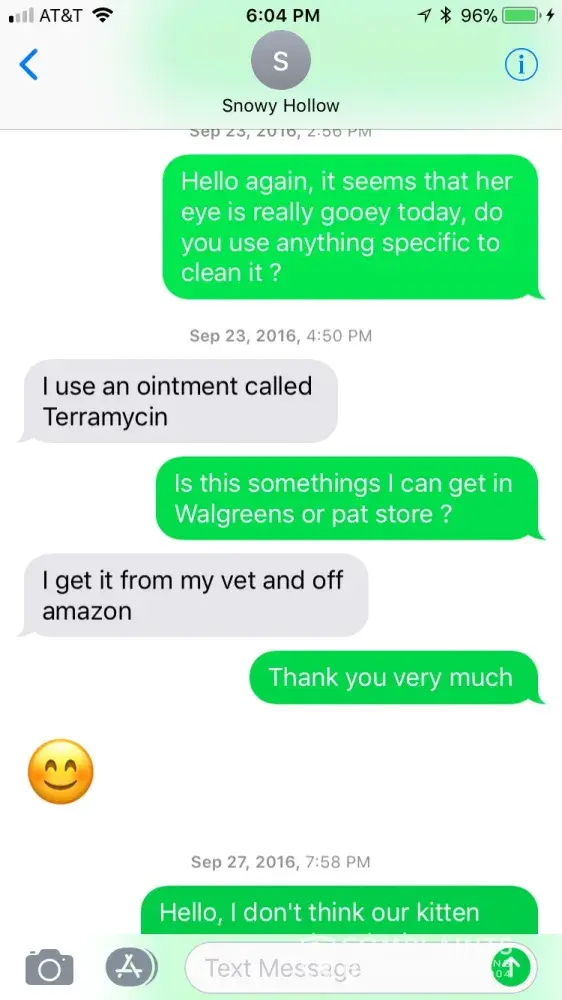It's been 3 months since purchasing my kitten from Snowy Hollow the beginning of October 2016 and I cannot recommend you purchase a kitten from Anastasia. The day after we took her home we took him to the vet because we were kind of concerned about his eye. This was something that I asked her about when we went to pick him up. She told me that he wasn't sick and that sometimes that happens with kittens when they are stressed. The vet diagnosed him with an upper respiratory infection. I guess I have to take some responsibility for taking her word for it and not being more picky. Well in the past three months I've basically just had a sick kitten. He's probably only been well for about a week or two the whole time. And this is after lots of vet bills and visits. I've kept Anastasia in the loop about it and she is sympathetic but doesn't offer much else. I personally don't think it's very ethical breeding practice to sell a sick kitten to someone. Especially with the price tag that comes with them. Right now, my Percy has a bad eye. Same eye that I was suspicious of when I brought him home. My vet said that Percy has feline herpes. I have no other cats so he contracted it before I got him. Now that I am a unhappy customer, my emails don't get answered. I would steer clear. If a breeder can't guarantee a healthy kitten, then I can't in good conscience recommend them. Now I know that sometimes cats just get sick, but when I bring a new kitten home and the next day the vet says it's sick...well it was sick before I took it home. That falls in the breeders hands. We are attached to Percy now, but it's very upsetting to look at my expensive cat and see a cat with a bad eye. His third eyelid is halfway closed all the time and his pupil doesn't dilate correctly. It may or may not go away. Who knows. I suspect that we will have lots of vet bills in the future. Possibly a surgery. Steer clear and find another breeder. This was my first time buying a pure bred cat and it's been a very bad experience.